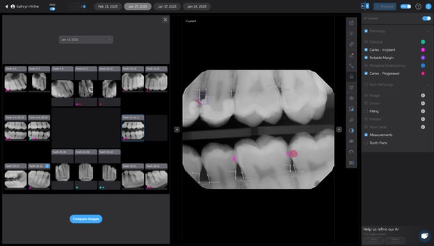 The Compare feature allows users to view and analyze images from different study dates side-by-side. This is particularly useful for monitoring disease progression, treatment effectiveness, or changes over time.