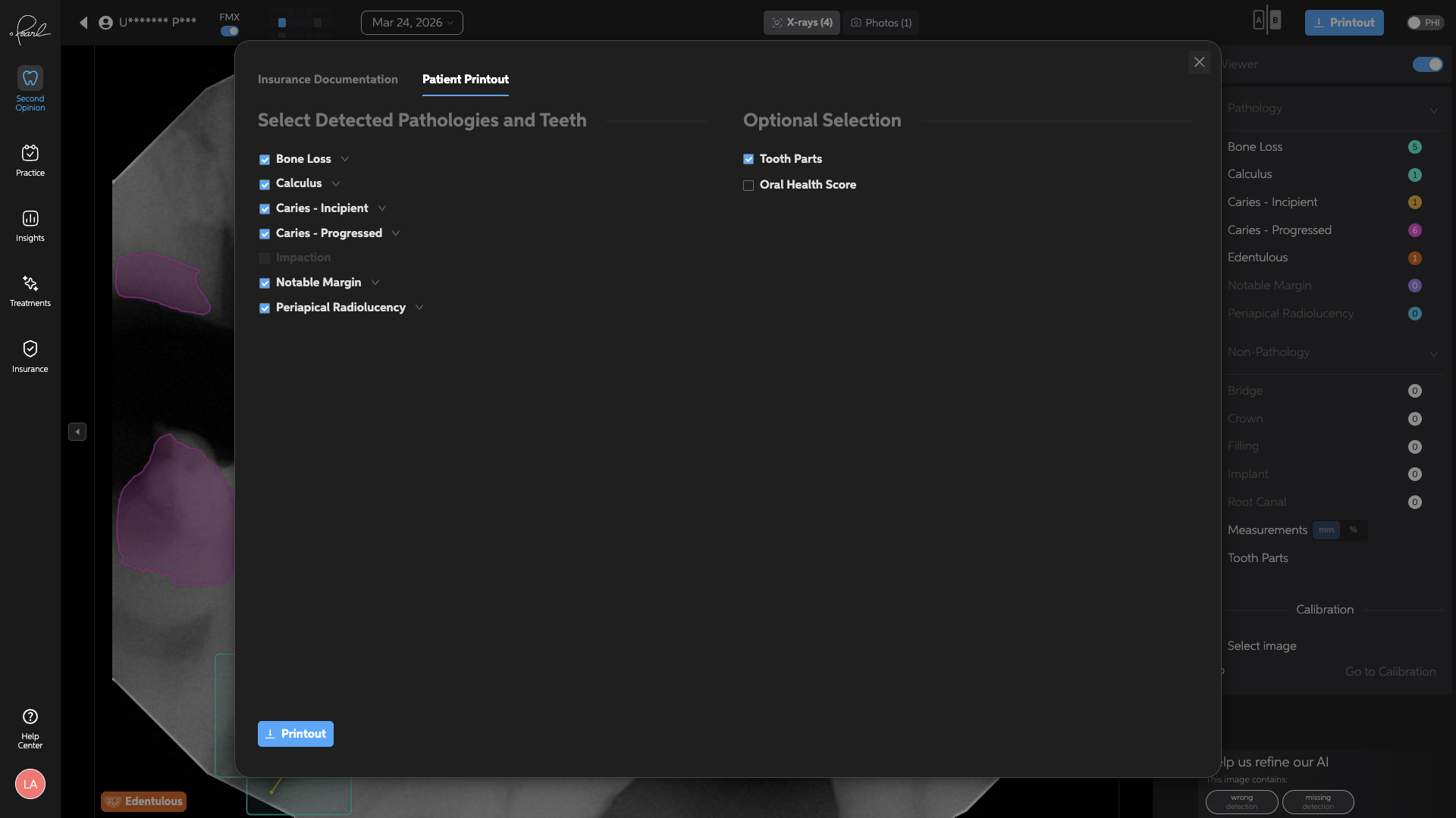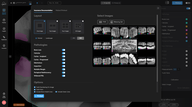 Creating Printouts for Patients and Insurance Pearl's Printout feature allows you to export diagnostic images and patient-friendly reports with flexibility. Whether for patient education or insurance claims, printouts provide a professional and customizable way to share findings. The printout modal now includes two tabs: Insurance Documentation and Patient Printout.