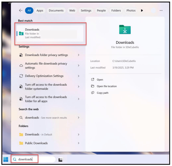 1. If you are on Windows and have the search bar at the bottom of your screen (Windows 10 or 11), type “downloads” in the search bar and then click into your Downloads folder.