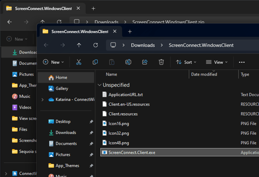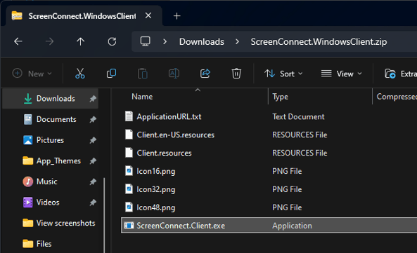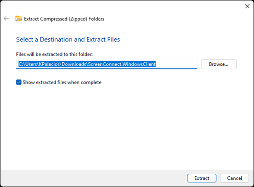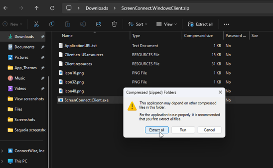 Extract all files by double-clicking on the ScreenConnect.Client.exe file. When prompted by Windows, click Extract all.