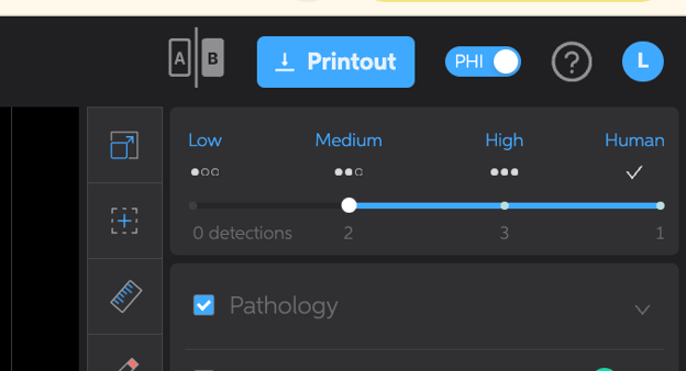Pearl's Sensitivity Slider allows you to adjust the display of AI detections based on confidence levels. This feature helps tailor the AI's suggestions to your clinical needs.