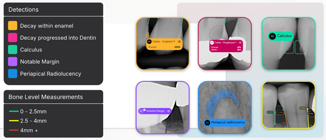 Second Opinion® is a powerful AI tool that assists in detecting a variety of conditions from dental radiographs. Below are the key detections supported by Second Opinion®.