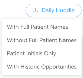 - When generating the Daily Huddle, you can select your view to include or exclude full patient names, Initials only, or to include historic opportunities.